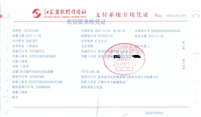 客戶對大貨非常滿意,當即在網(wǎng)銀向我們付余款182924元。