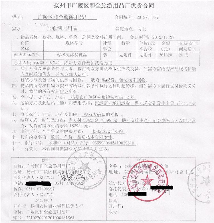 至此東莞南華國際酒店交易完成,雙方都非常滿意,揚州市廣陵區(qū)和全旅游用品廠會在高端酒店用品市場會越走越好,以價格、質(zhì)量、交貨期為前提,讓客戶滿意。